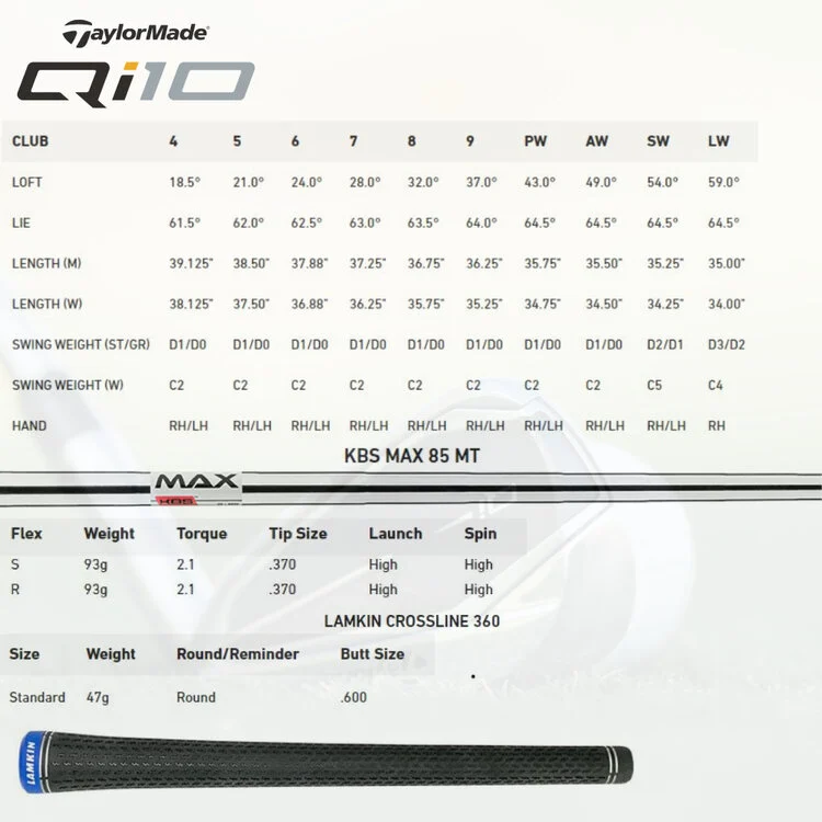 De TaylorMade Qi 2024 ijzers zijn in de versie met stalen shaft voorzien van de lichte KBS Max 85 MT steel shafts en Lamkin Crossline 360 standaard heren grips.